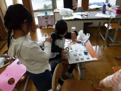 これまでに集めたどんぐりや,まつぼっくり,落ち葉を使って,おもちゃや飾りをつくりました。どんぐりを使って,マラカスをつくったり,まつぼっくりを使って,けん玉をつくったりしました。