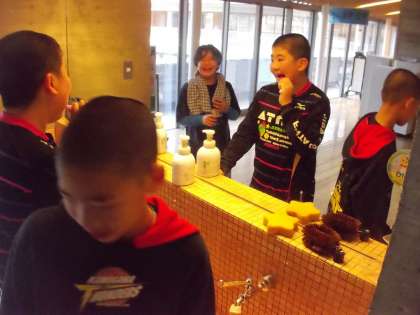新盛先生が,6年生の歯磨き指導をして下さいました。赤い着色料で染め出して,磨き残しを丁寧にきれいにしていきました。さすが6年生,磨き残しも多くなく,汚れの残ったところもしっかりと落とすことができました。