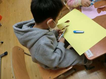 クリスマスの飾りづくりをしています。折り紙や画用紙を使って,「クリスマスツリー」や「サンタクロース」をつくりました。