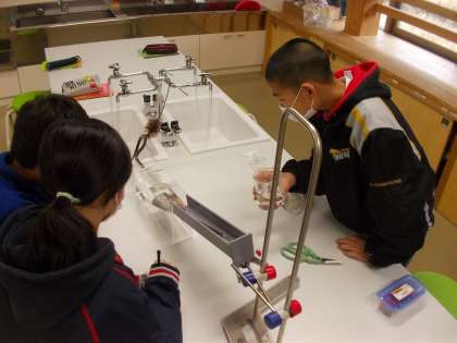 地層のでき方を調べるため,堆積実験装置を使って,流れる水が層を作る様子を観察しました。重い砂が先に下に沈むことで層ができる様子がよく分かりました。