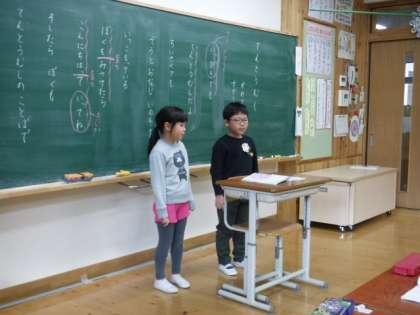 2人組で「てんとうむし」の音読発表をしました。てんとうむしの声のところは小さく読んだり,実際にてんとうむしの動きをしたりするなど,工夫して読んでいました。