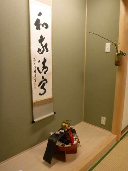床の間には,お正月の飾りやお花,掛け軸を