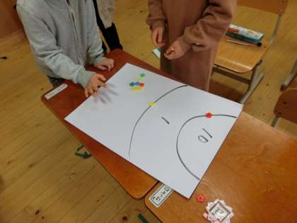 2人組でおはじきゲームをして点数を競いました。ゲームを楽しみながら,点数を比べるときには,「まず十のくらいを見るとよい」ということに気付いていました。