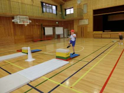 いろいろな跳び方ができるようになってきました。できる跳び方で,高い段にも挑戦しています。