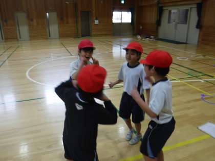 グループで考えた動きを,テンポの良い曲に合わせて発表しました。