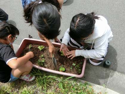理科の学習で使うアサガオを,ポットからプランターに植え替えました。元気に大きく育ちますように!