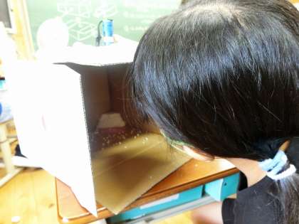 今日から図工では,「のぞいてみると」の学習をしています。箱の中に差し込んだ光から,さまざまな世界を想像して,その世界を箱の中に作り出します。「光が雪に見えるから雪の世界を作ろう。」「光を暗闇の中で光るスポットライトにしよう。」と,想像を膨らませながら作品を作っていました。