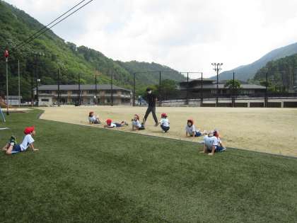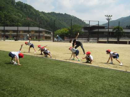 体育の学習でターザンロープの遊び方を学習し,一人一人ターザンロープをしてみました。「もっとしたい。休み時間もしよ!」と楽しんでいました。その後,まねっこあそびをしました。友だちの動きをまねして楽しみました。おもしろい動きをしている子のまねをみんな一生懸命していました。
