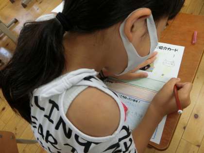 今日は「他己紹介カード」を書きました。友達のよいところや素敵なところを一生懸命考えて書いていました。