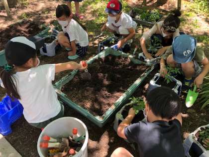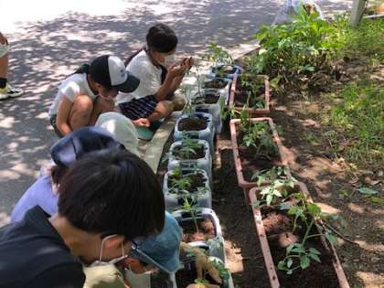 本日3時間目の生活でミニトマトの苗植えをしました。