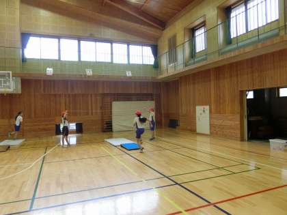 今日はあいにくの雨だったので,体育館でおこないました。いろいろな場で,「力強くふみきる」「目線を上げて高くとぶ」といったポイントを意識して練習をしました。