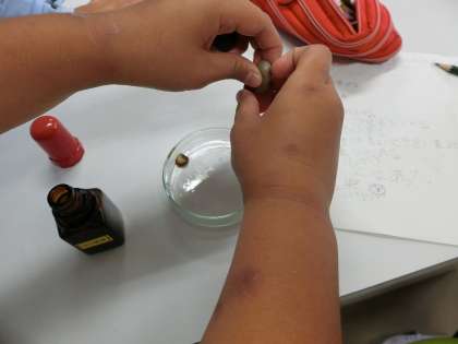 ヨウ素液を使って,種子の中に養分が含まれているのかを確かめる実験をしました。インゲンマメは,種子の中の養分を使って発芽し成長していることがよく分かりました。