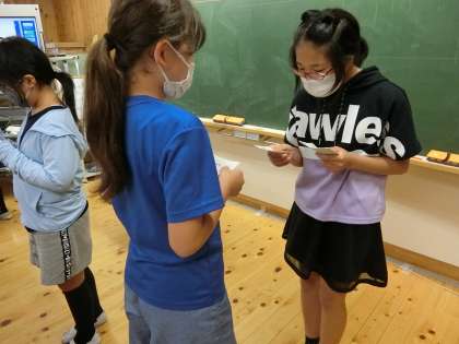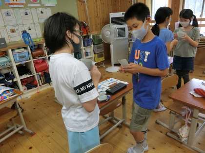 自分の名前や好きなものがかかれた名刺を交換しながら自己紹介をし合いました。これまでに学習した表現を使いながら,楽しく名刺交換ができました。