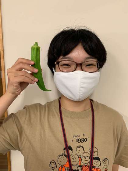 昨日のオクラよりも,さらに大きい実ができていました。写真から伝わるでしょうか・・・担任の顔とほぼ同じ大きさです。