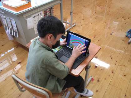 今日の外国語活動では,クイズや歌う活動を通して,色の言い方に慣れ親しみました。学習の最後にが,色々な国の子どもたちの描いた虹とそれぞれがコンピュータを用いて描いた虹を見ながら,多様な考え方があることについても気付くことができました。