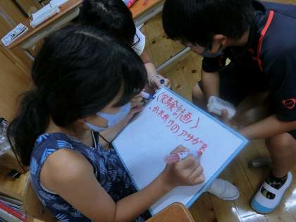 受粉によってどのようなことが起こるのかを調べる実験をしました。まずはじめに,グループで実験方法を話し合いました。夏休み前に行った,植物の発芽条件の実験方法を思い出しながら考えていました。話し合いの結果,受粉させたアサガオと,受粉させなかったアサガオの様子をを比べる実験を行うことになりました。その後,開花前のアサガオのつぼみからおしべを取り除く作業を行いました。この実験結果が分かるのは約1〜2週間後です。どんな結果になるか楽しみですね!