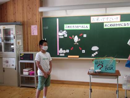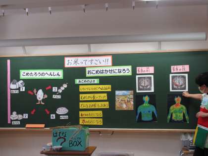今日は,3年生になって初めての食の学習でした。今日は,栄養教諭の小林先生と一緒に,「おこめはかせになろう」よいうめあてでお米について学習しました。「お米は,蒸すことができる。」「お米は変身したらお餅になる。」「お米には神様が住んでいて大切に食べないといけないもの」など,子どもたちはお米について知っていることをたくさん発表していました。