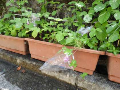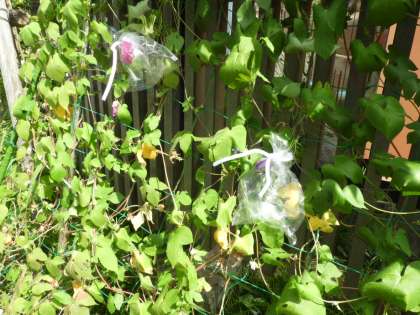 おしべを取り除くのがとっても難しいのですが,5年生は一生懸命取り組み,学級園にはビニル袋をかぶった花が並んでいます。