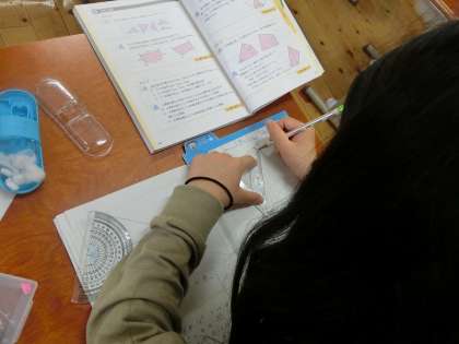 算数では,合同な三角形のかき方を考えています。分度器やコンパスを使って,丁寧に作図をしています。