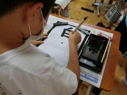 今日の書写では,毛筆で「白雲」という字を書きました。今回のめあては「白と雲の文字の大きさに気を付けよう」です。お手本を見ながら丁寧に書いていました。