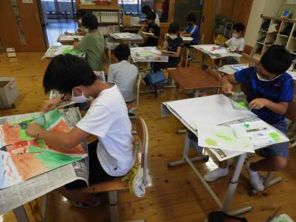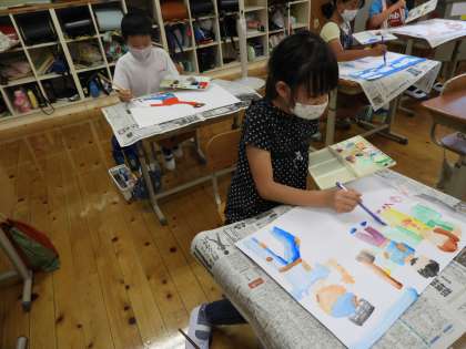 お話を聞いて,好きな場面を画用紙にかいています。