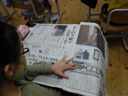 国語では,今日から新しい学習が始まりました。この学習では「新聞の書き方」を知ったり,記事を読んで思ったことを交流したりします。今日は,新聞の1面を読んで気付いたことを話し合いました。「どんな記事が書いてあるかパッと見て分かるように,見出しを大きく書いているんだね。」と,新聞の書き方の工夫を考えていました。