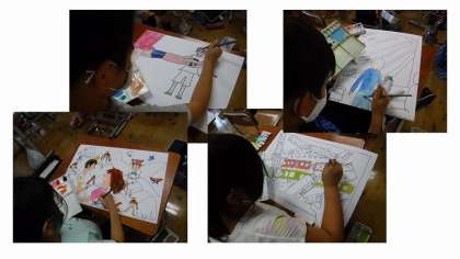 色塗りの作業に入っています。色むらを作ったり,重ね塗りをしたり,筆を動かす方向を工夫したりして,立体感や動きを出すことを意識しています。子どもたちは集中して,一つ一つ丁寧に塗っていました。