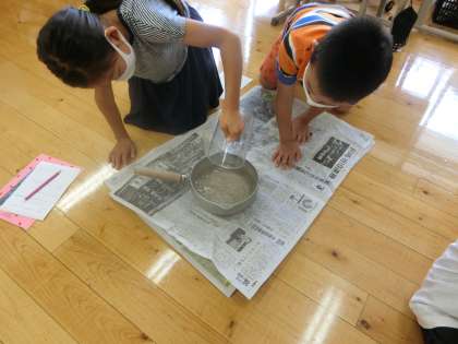 本日の算数科の学習は,色々な入れ物に1Lと思うかさの水を入れたり,1Lの水が入る入れ物を探したりしました。