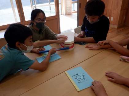 今日は,視力検査の前に「保健指導」がありました。今回は,歯周ポケットの磨き方をグループで考えました。「歯ブラシをたてにして磨いたらいいと思うよ。」「歯と歯茎の間を丁寧に磨かないといけないね。」と,歯の模型を見ながら熱心に話し合っていました。