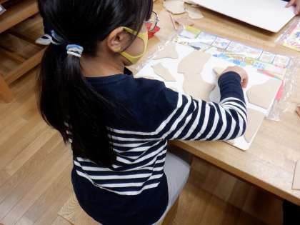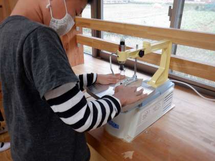 図工では,「ビー玉が転がる楽しいめいろ」を作っています。切った板を台に貼って,コースを作ります。今日は,電動のこぎりを使って板を切りました。曲線も上手に切ることができていました。どんなめいろができるか楽しみです!
