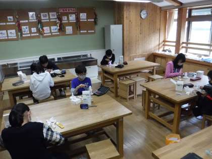 図工室のとなりの理科室で暗幕を閉め,自分で表したい光の効果の様子を,一人一人がデジタルカメラで撮影しました。