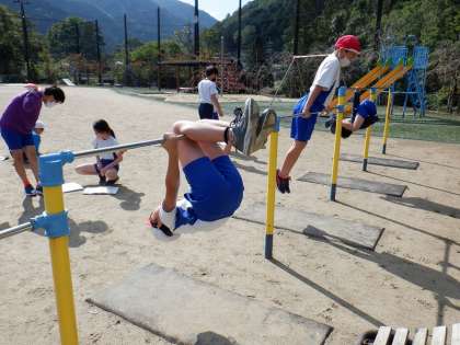 体育では「鉄ぼう」の学習が始まりました。新しい技にも積極的に挑戦して,できる技を増やしていきましょう!
