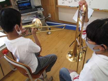 金管総合を再開してから早1ヶ月。今日からはいよいよ3年生が各パートに入って練習を開始しました。5,6年生が中心になりながら,3年生に音階の吹き方や楽器の持ち方など基本的なことを教えていました。「ドレミが吹けた!」「楽器が重かったけど,音がきれいに鳴った」など,初めてのパート練習が楽しかったようです。