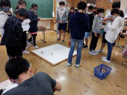今日はあいにくの雨でしたが,休み時間に,5,6年生が「こままわし」を楽しんでいました。雨の日は,雨のにしかできない遊びに親しむのもいいですね。