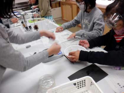 今日は「もののとける量を増やすにはどうすればよいのだろう」ということをみんなで考えました。子どもたちは「水の量を増やす」「水溶液をあたためる」という2つの方法を予想し,実際に実験をして確かめました。