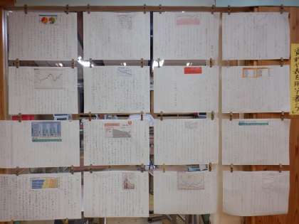 国語では,「社会はよりよい方向に向かっているか」というテーマで文章を書きました。文章の中では,資料や表を用いて,自分の主張に説得力をもたせています。教室前に掲示していますので,個人懇談会の際にぜひご覧ください。