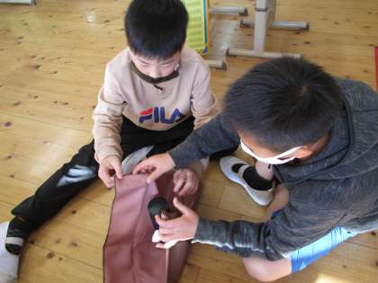 「ふろしきって何?」ふろしきを見たことがない3年生たち。道徳の学習では,「ふろしき」の話を読んだ後に,日本の伝統や文化のよさについて話し合いました。その後,実際にふろしきで四角いものや丸いものを包み,「丸いものを落とさないで運べるなんてすごい!」などと言いながら,ふろしきの良さを感じていました。