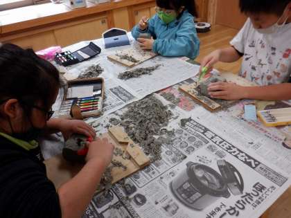 粘土の塊を,彫刻刀やピーラーでほったりけずったりして,感じたことや思ったことを立体に表しました。子どもたちは,粘土の形を変えながら,「〜に見えてきた。」と想像を膨らませながら活動をしていました。