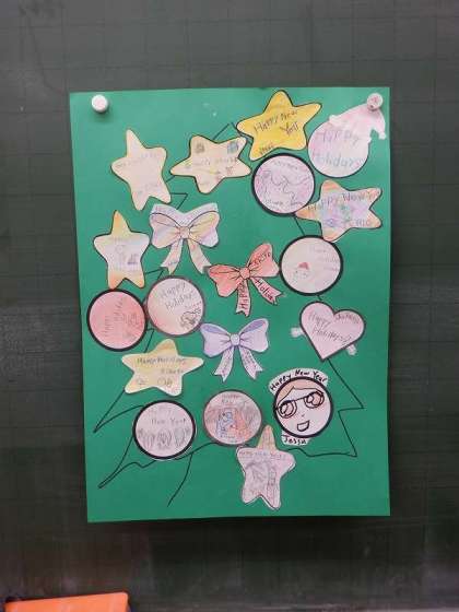 今日はALTのジェッサ先生に来ていただき,みんなでクリスマスツリー作りをしました。いろいろな形のカードにメッセージを書き,それをツリーに飾っていきました。素敵なクリスマスツリーができあがりました。