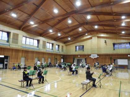 体育館で全員が集まり,「さんぽ」を演奏しました。