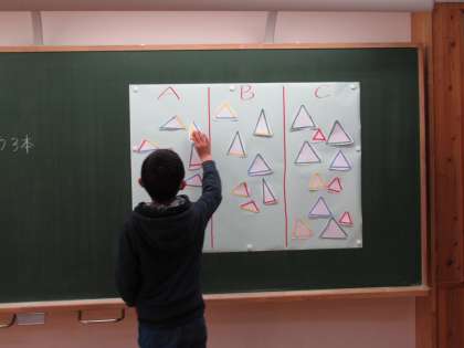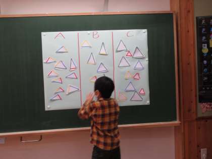 今日から,三角形の学習に入りました。色棒を並べて三角形を仲間分けし,二等辺三角形と正三角形の特徴を捉えることができました。