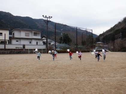風に向かって走ると袋が膨らみ,飾りがなびく様子を楽しみました。