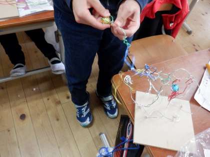 今日の図工では,ワイヤー(針金)をまげたり,つなげたり,巻いたり…と,形を変えて,立体作品をつくりました。ワイヤーの形を変える中で,面白い形をたくさん見つけていました。