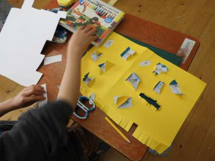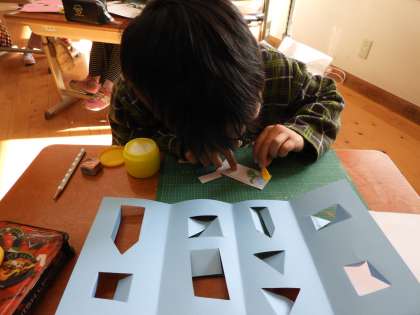 カッターナイフを使って,いろいろな形の窓を開けました。