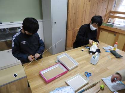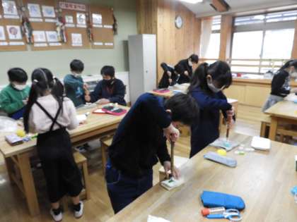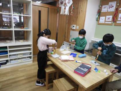 ペットボトルにきりで穴を開けます。きりの使い方に慣れてきた4年生。どんどん活動を進めることができました。