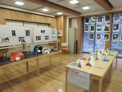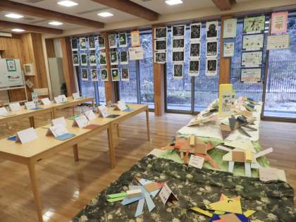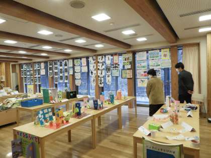 ランチルームには,学年ごとの平面作品と立体作品がそろいました。