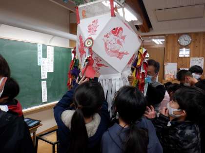 実際に赦免地踊りの本番でかぶる灯籠も持ってきていただき,一人一人かぶらせてもらいました。見た目以上に重たかったようで,「これで真っすぐ歩くのは大変!」と言いながら,細かいところまで丁寧に仕上げられた切り絵に見とれていました。