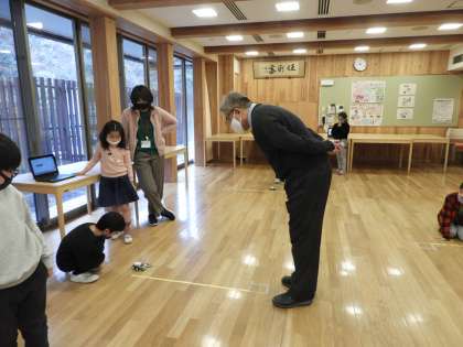 ブロックで作った車を,ちょうど1m走らせるためには,どのようにプログラムを組めばよいのか,二人組で考えました。
