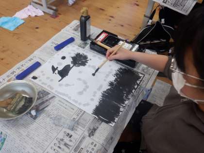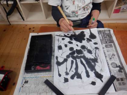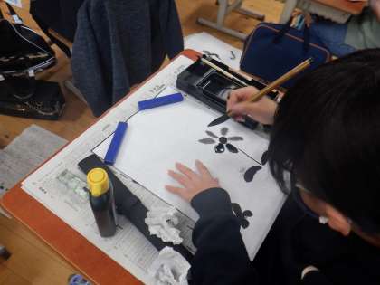 墨と水のつくる形や色の特徴を生かして,思い描いた世界を表しました。水をぬった上に墨を置いたり,墨を少しずつ下にたらしたり,歯ブラシで墨を飛ばしたりと,様々な工夫をして作品をつくっていました。