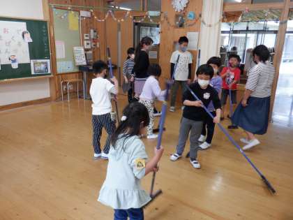 今日から1年生の掃除のお手伝いにいっています。箒の持ち方や掃き方などを,丁寧に優しく教えてあげていました。